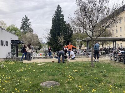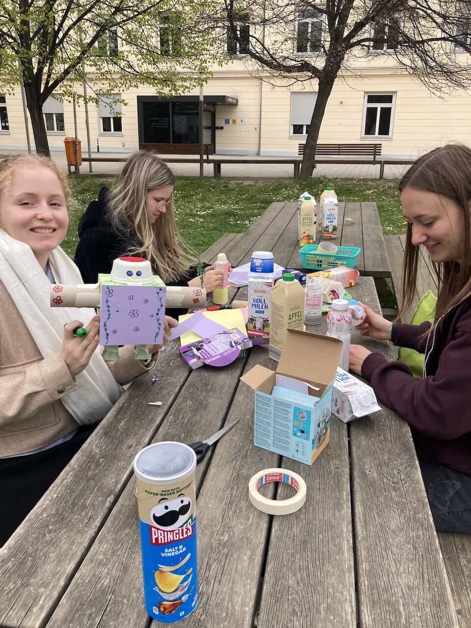 Dabei entstand eine beeindruckende Bandbreite an Ideen: vom gemeinsamen Müllsammeln über kreatives Gestalten mit wiederverwertbaren Materialien, wie dem Bau von „Müll-Monstern“ oder Kunstdrucken aus Milchkartons, bis hin zu Upcycling-Projekten mit PET-Flaschen. Auch das richtige Mülltrennen wurde spielerisch vermittelt, ebenso wie komplexere Themen – etwa durch den Bau einer einfachen Kläranlage oder die Planung eines „Baum-Konzepts“ für den Campus.